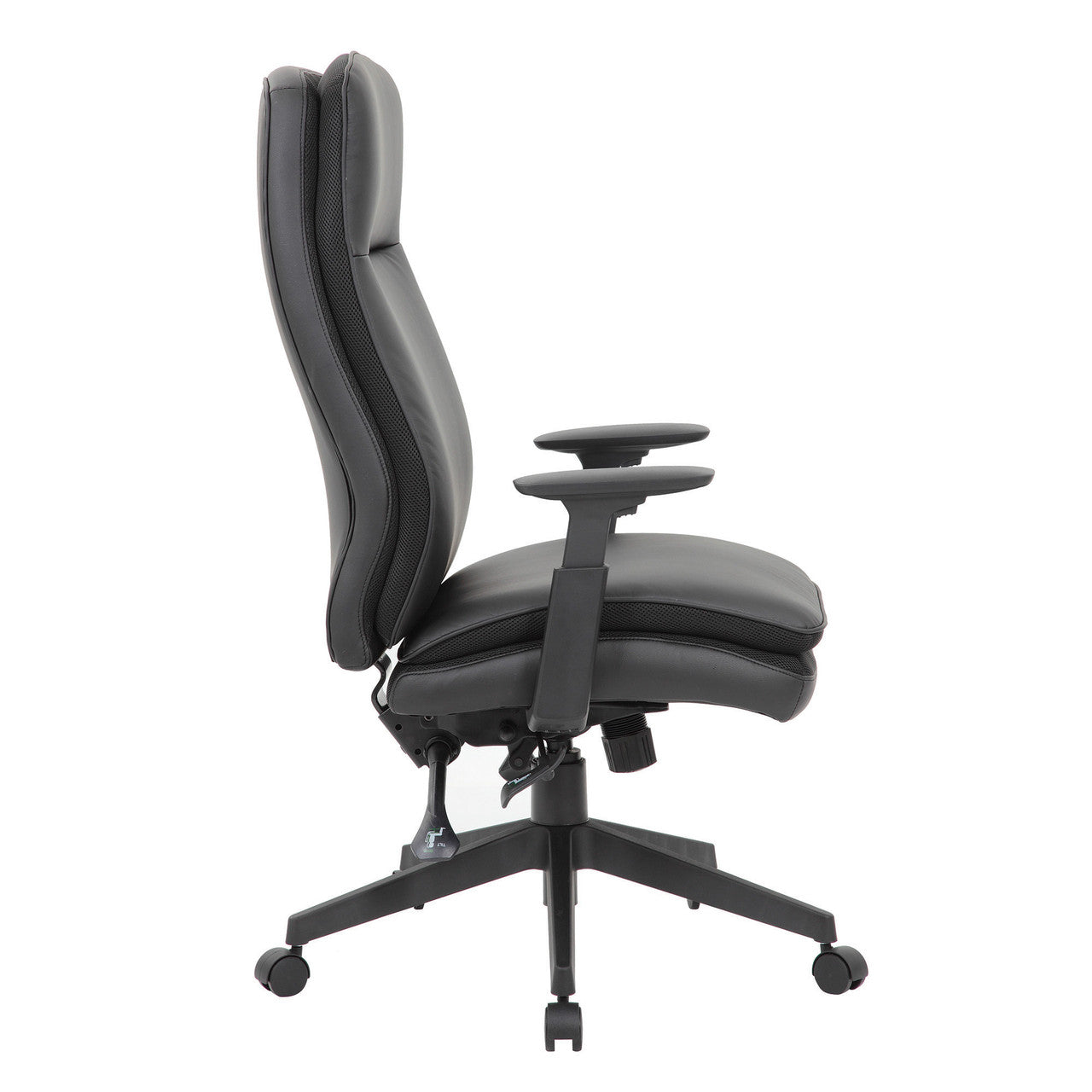 This modern high back executive task chair brings comfort and stability to any office environment. It features beautiful and durable Caresoft Plus upholstery and high-back styling with exemplary lumbar support & height adjustable arms. In addition, the chair features a pneumatic gas lift seat height adjustment, adjustable tilt tension control and a multi-function 3 paddle mechanism Its high crown large 27” 5 star nylon base provides stability while affording plenty of mobility thanks to its five hooded double wheel casters.