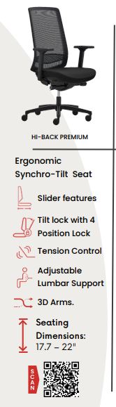 The Adapt High Back Chair has a firm seat cushion to provide proper sitting support. The mesh back is sleek and allow for free upper body movement. 3D Arm pads move side to side and forward and back with locking mechanism. A sliding seat pan allows users with long and short legs and everywhere in between to enjoy the comfort of this chair.