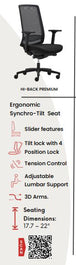 Soft mixed mesh material padded arm rests, ergonomically designed seat with 2" molded foam and sloped edge. Featuring a full array of standard adjustments including: Seat Depth, Tilt-Lock/Tension control and 3D arms.