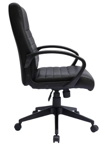 The Ribbed Back Task Chair with polypropylene fixed arms (for durability) offers exceptional features such as tilt tension, a pneumatic gas lift for easy height adjustments and an upright lock. The chair is upholstered in black vinyl, called CaressoftPlus Vinyl which is ultra-soft, breathable upholstery that looks & feels like leather, but more durable & easy to clean. It also boasts a sturdy high crown 25 inch nylon base with 2 inch nylon dual wheel castors for a smooth roll and has a weight limit of 275 lbs.