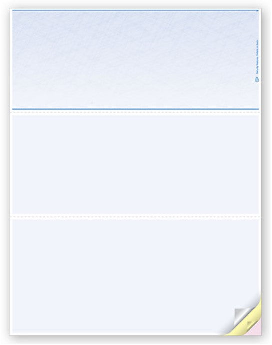 Efficient blank top checks are great for multiple accounts - save money, time & space with only 1 check inventory to manage.Our blank top laser checks cost less than custom printed business checks & work easily with your financial software!Reduce check fraud risks! Our blank computer check stock features advanced security features, while keeping account numbers confidential until printing.